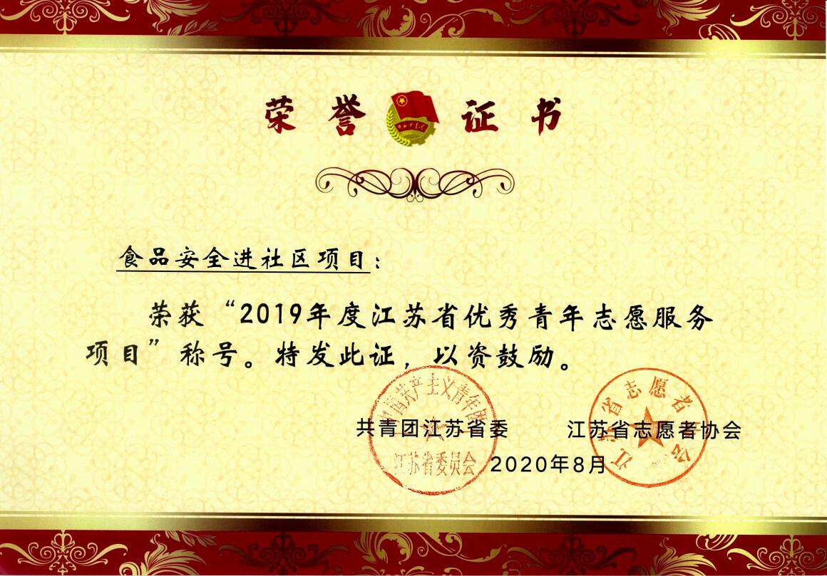 “食品安全进社区”项目荣获“2019年度江苏省优秀青年志愿服务项目”称号,为抖阴