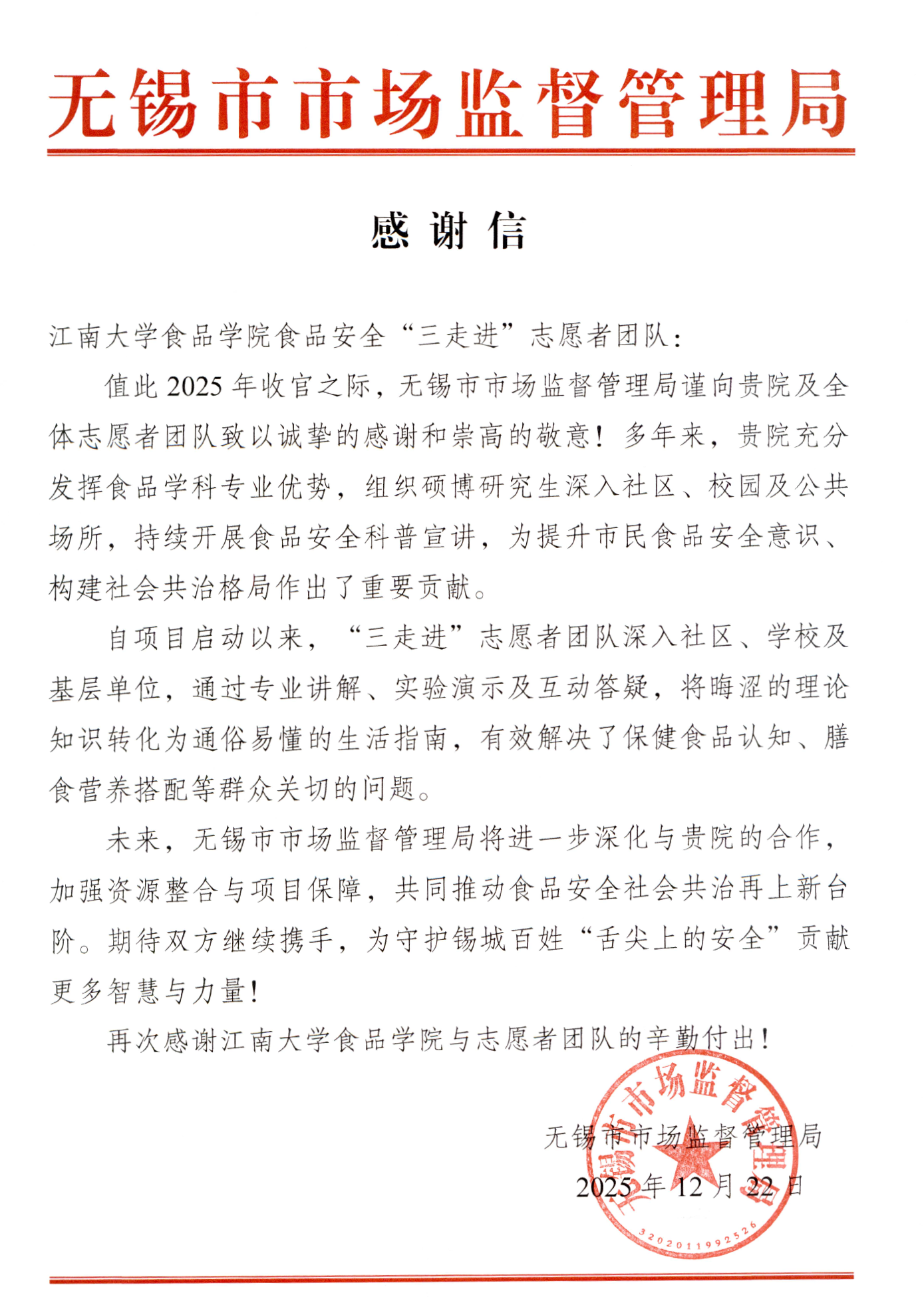 及全体志愿者团队发来感谢信,对双方在食品安全社会共治方面的协作成果给予充分肯定。感谢信是对我们双方携手服务社会、共建食安防线工作的生动注脚,也为未来的合作注入了更强的信心。展望新征程,希望抖阴