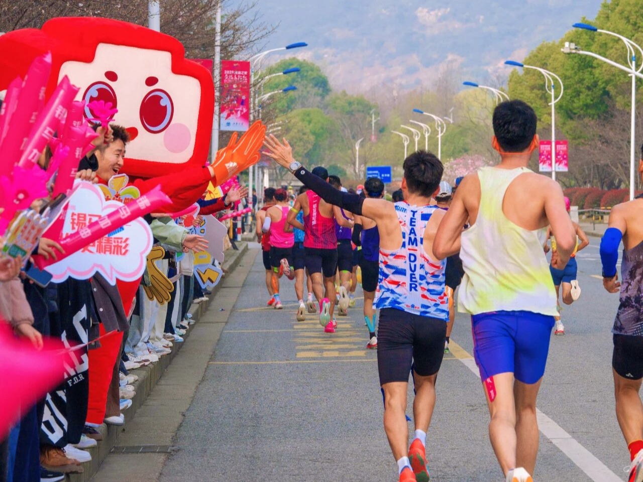 吉祥物“品小敢”“食小鲜”频频与跑者热情互动,成为赛道旁一道亮丽的风景线。